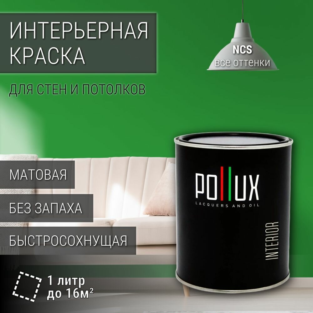 Краска моющаяся интерьерная для стен и потолков, Pollux INTERIOR без запаха, быстросохнущая, акриловая, матовое покрытие, цвет NCS S 2070-G20Y, 1л. информация: