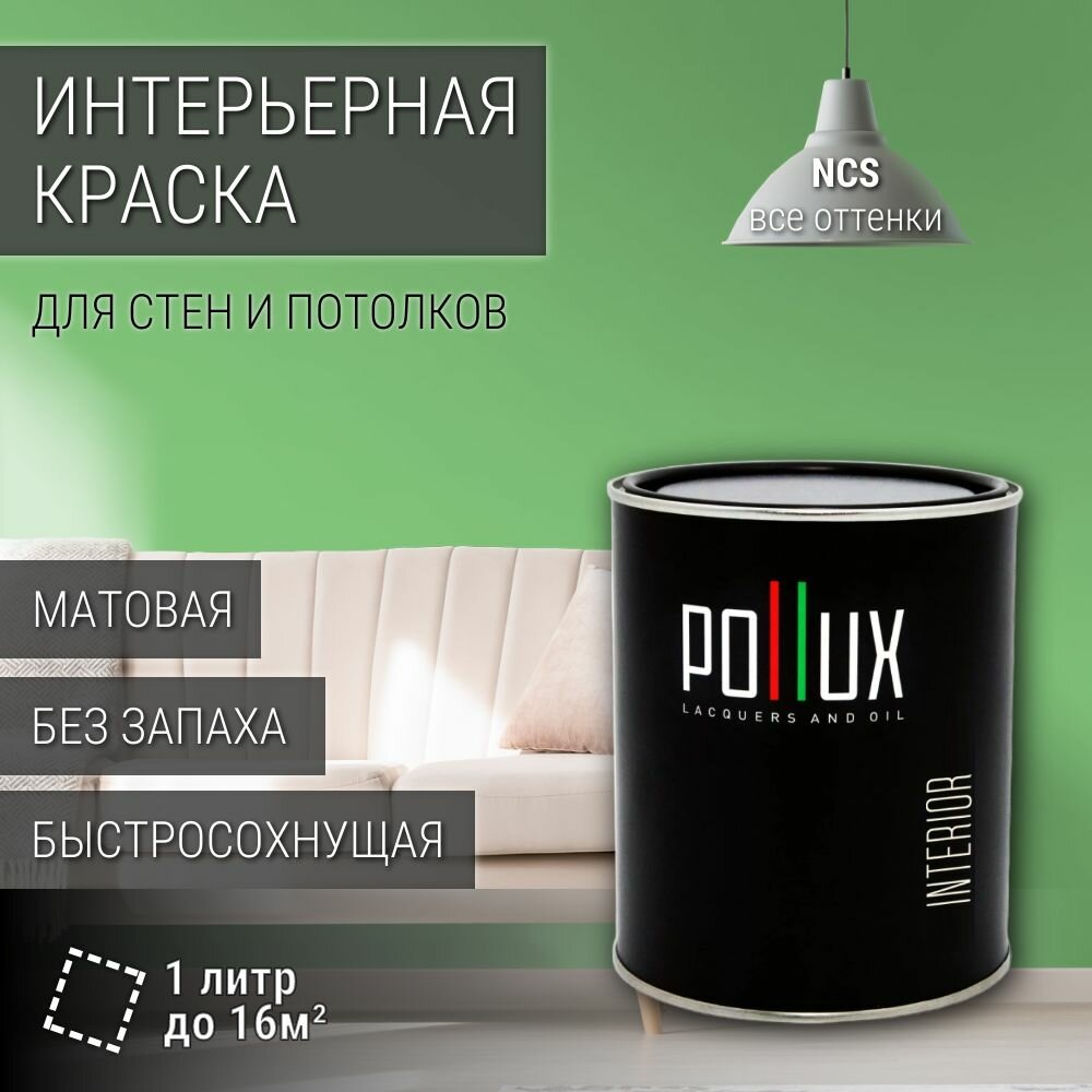 Краска моющаяся интерьерная для стен и потолков, Pollux INTERIOR без запаха, быстросохнущая, акриловая, матовое покрытие, цвет NCS S 1050-G20Y, 1л. информация: