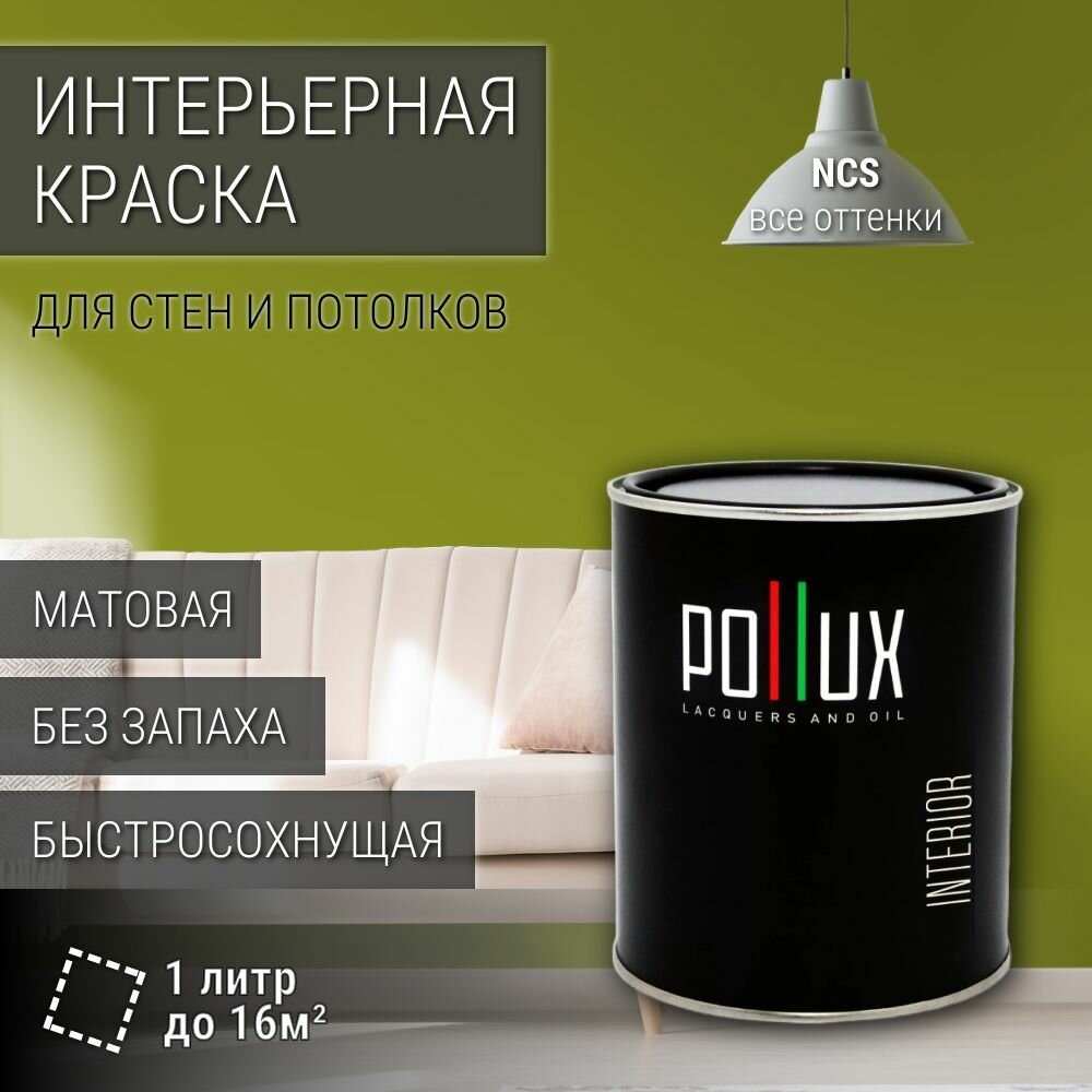 Краска моющаяся интерьерная для стен и потолков, Pollux INTERIOR без запаха, быстросохнущая, акриловая, матовое покрытие, цвет NCS S 3060-G60Y, 1л. информация: