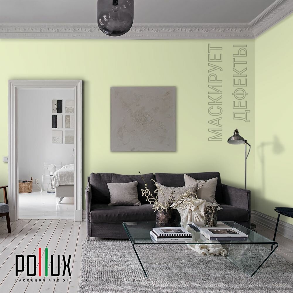 10 цен на Краска моющаяся интерьерная для стен и потолков, Pollux INTERIOR без запаха, быстросохнущая, акриловая, матовое покрытие, цвет NCS S 0515-G60Y, 5л.