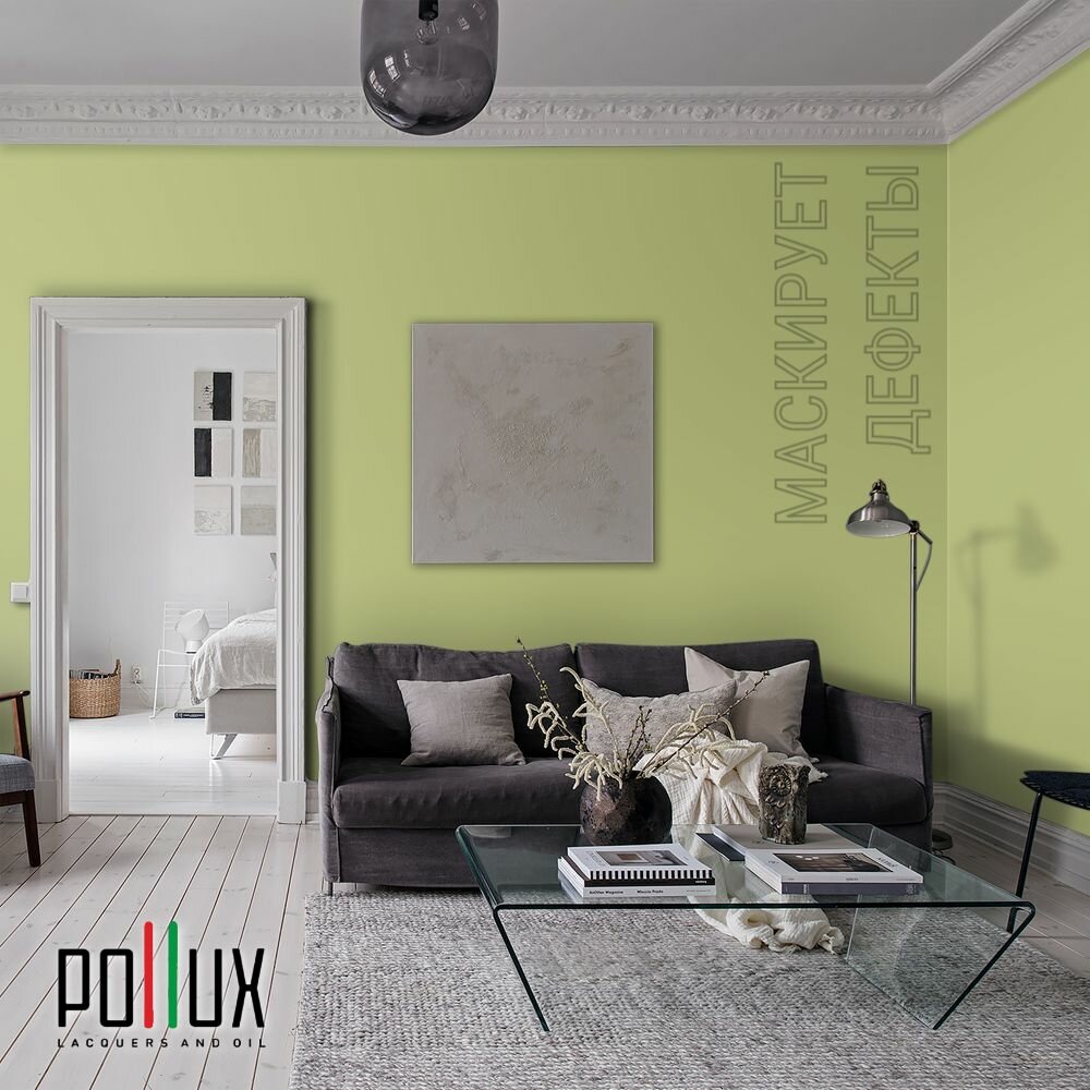 10 цен на Краска моющаяся интерьерная для стен и потолков, Pollux INTERIOR без запаха, быстросохнущая, акриловая, матовое покрытие, цвет NCS S 2030-G60Y, 5л.