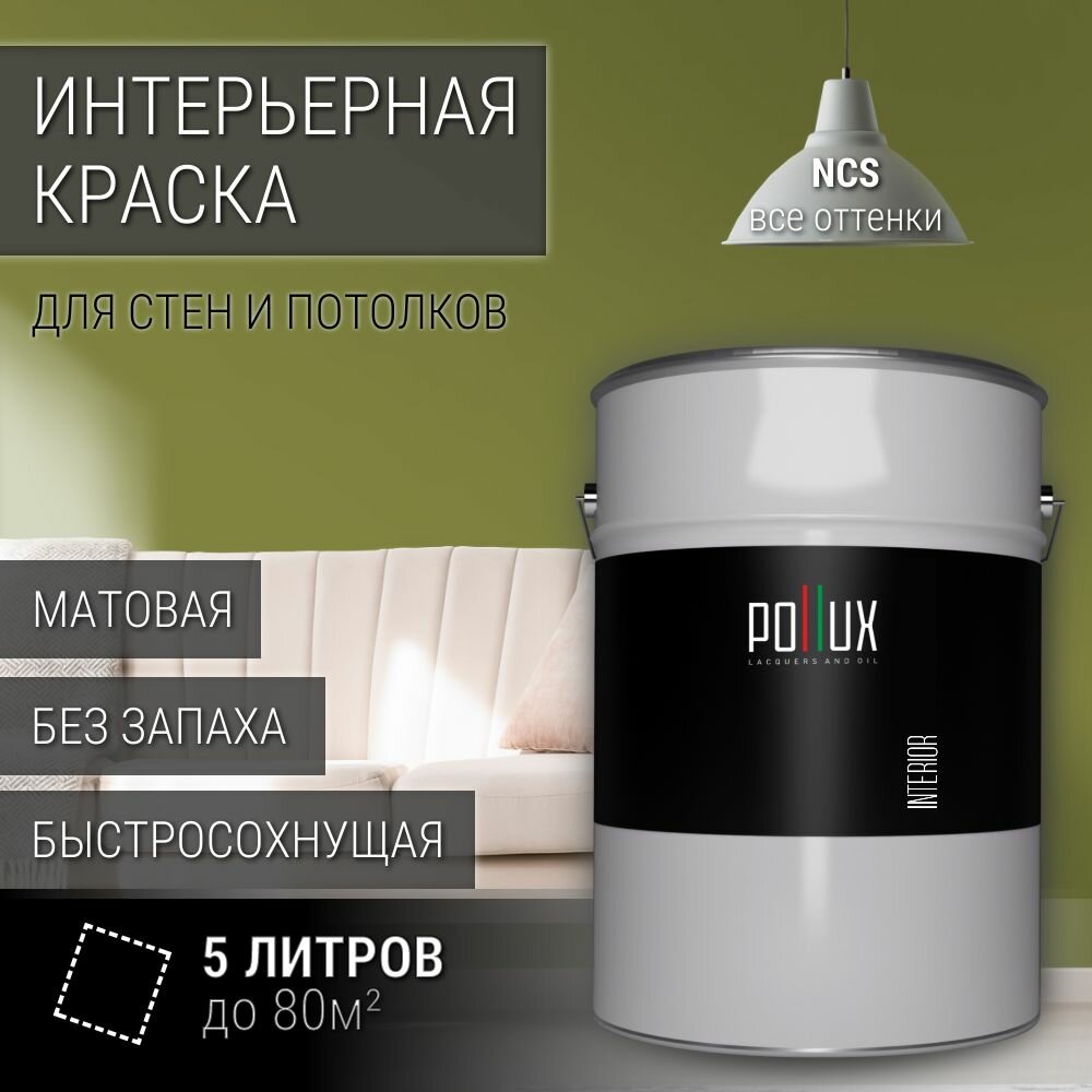 Краска моющаяся интерьерная для стен и потолков, Pollux INTERIOR без запаха, быстросохнущая, акриловая, матовое покрытие, цвет NCS S 3040-G60Y, 5л.