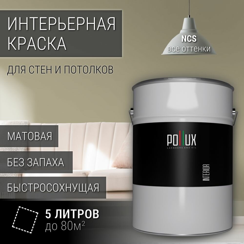 Краска моющаяся интерьерная для стен и потолков, Pollux INTERIOR без запаха, быстросохнущая, акриловая, матовое покрытие, цвет NCS S 3010-G90Y, 5л. информация: