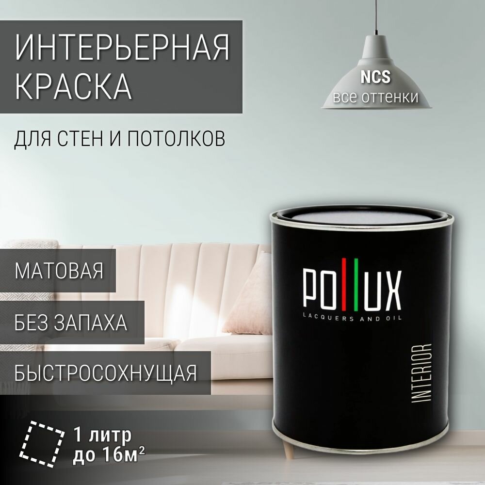 Краска моющаяся интерьерная для стен и потолков, Pollux INTERIOR без запаха, быстросохнущая, акриловая, матовое покрытие, цвет NCS S 1005-B50G, 1л.