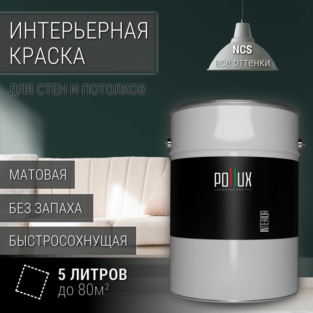 Краска моющаяся интерьерная для стен и потолков, Pollux INTERIOR без запаха, быстросохнущая, акриловая, матовое покрытие, цвет NCS S 8010-B50G, 5л. информация: