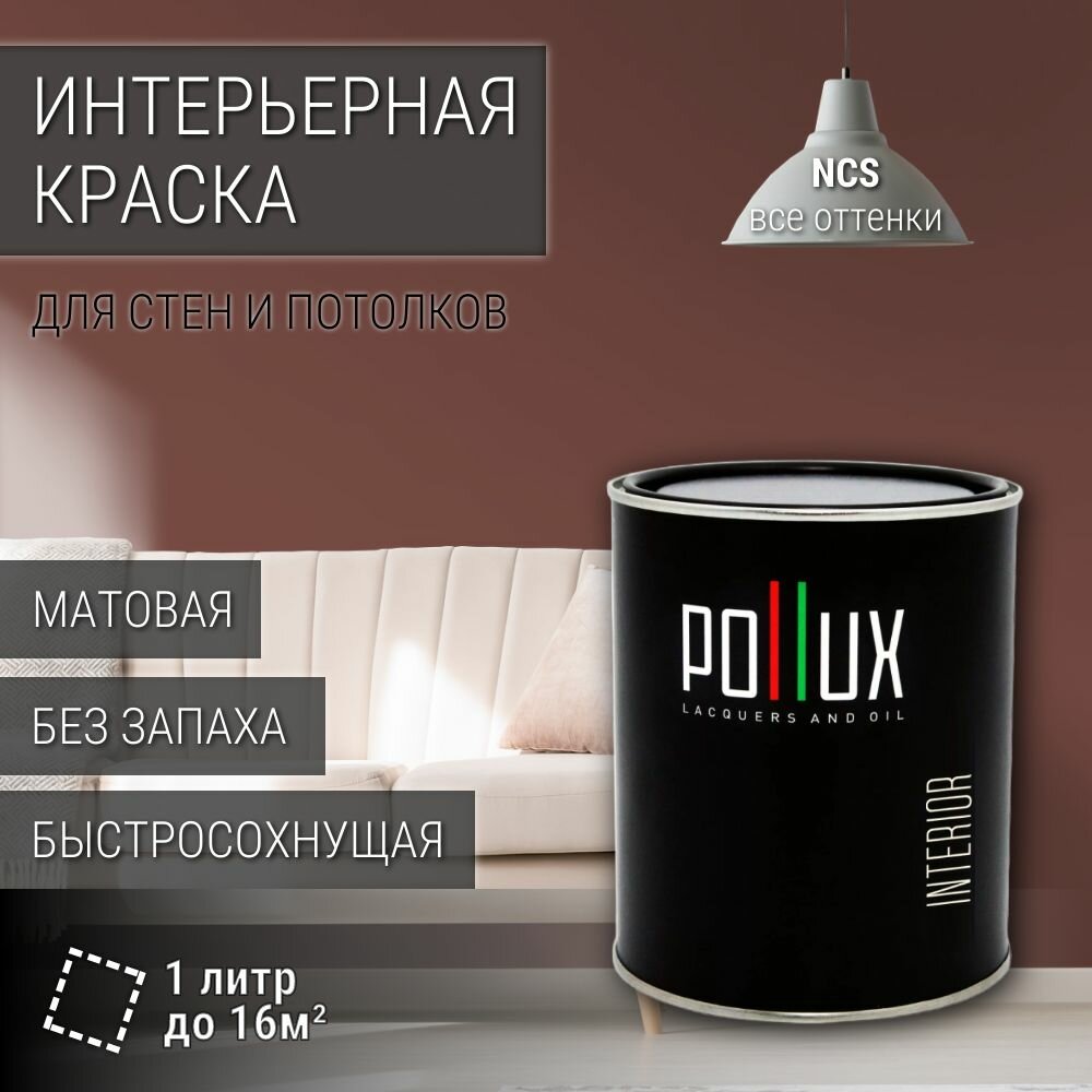 Краска моющаяся интерьерная для стен и потолков, Pollux INTERIOR без запаха, быстросохнущая, акриловая, матовое покрытие, цвет NCS S 7020-Y80R, 1л. 2 535 ₽