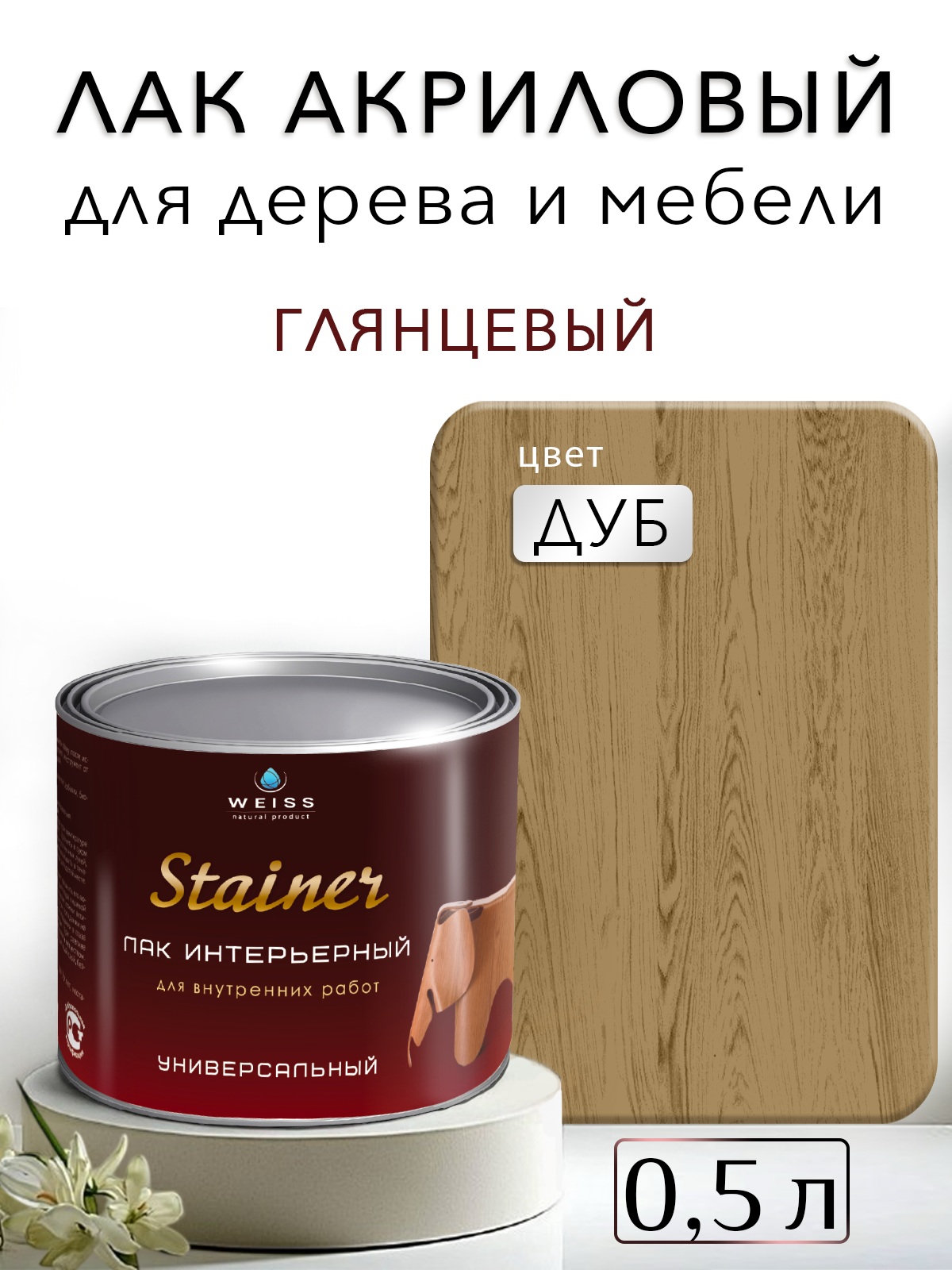 Лак для дерева акриловый дуб, глянцевый, Weiss natural product, без запаха, самовыравнивающийся, 0.5л информация:
