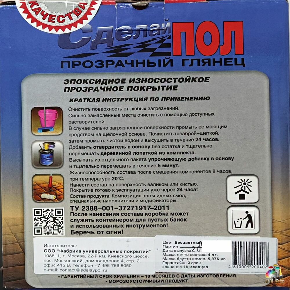 Эпоксидное покрытие Прозрачное антискользящее 2-х компонентное до 12 м2 "Сделай пол", для пола и стен на улице и в интерьере информация:
