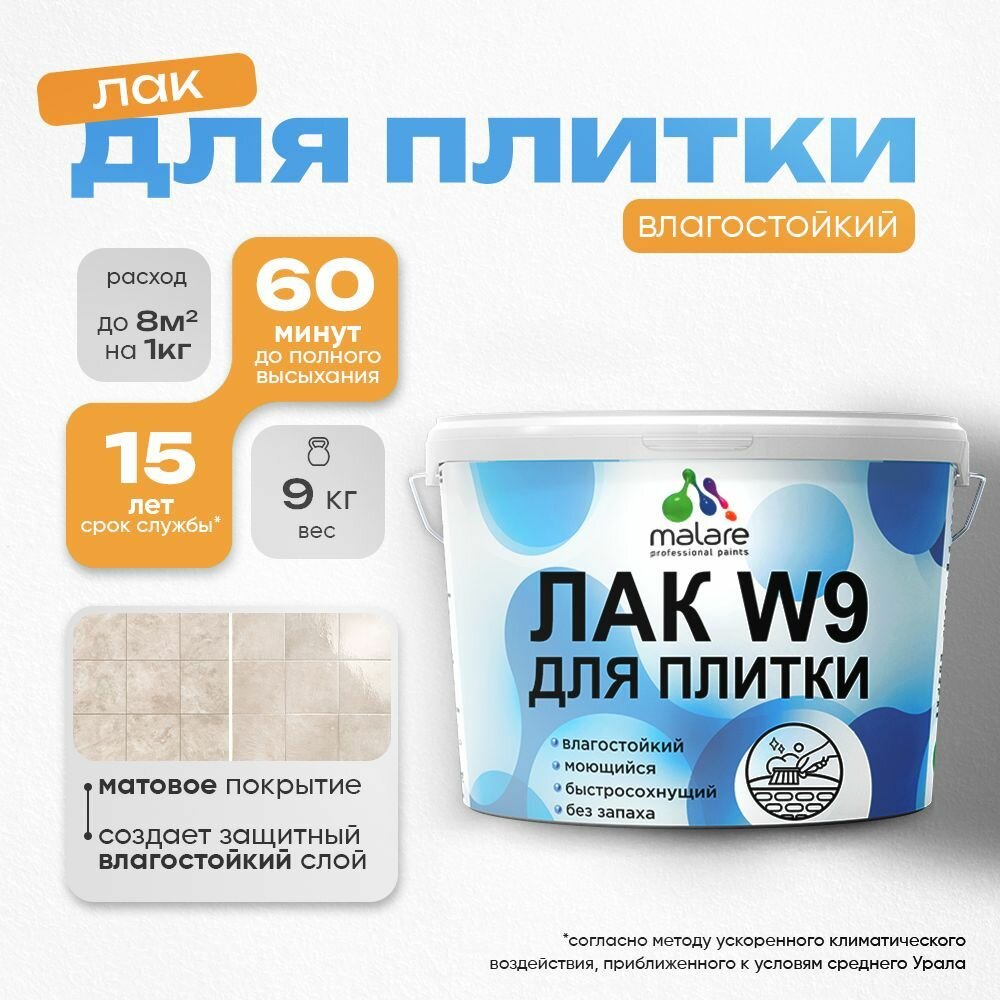 Лак для защиты плитки и кафеля Malare акриловый влагостойкий моющийся быстросохнущий, матовый, 9 кг информация: