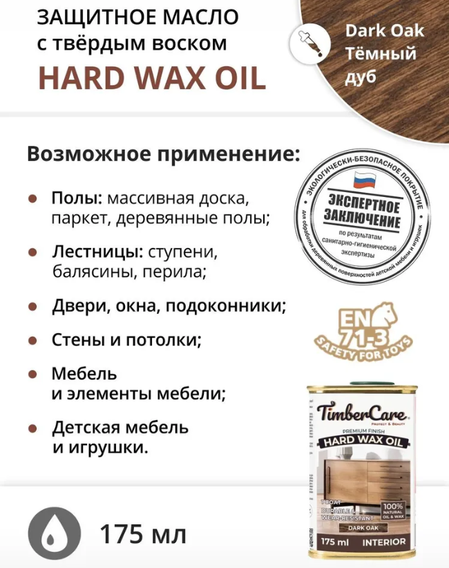 Защитное масло с твердым воском TimberCare Hard Wax Oil, Тёмный дуб/ Dark Oak 0,175 л информация: