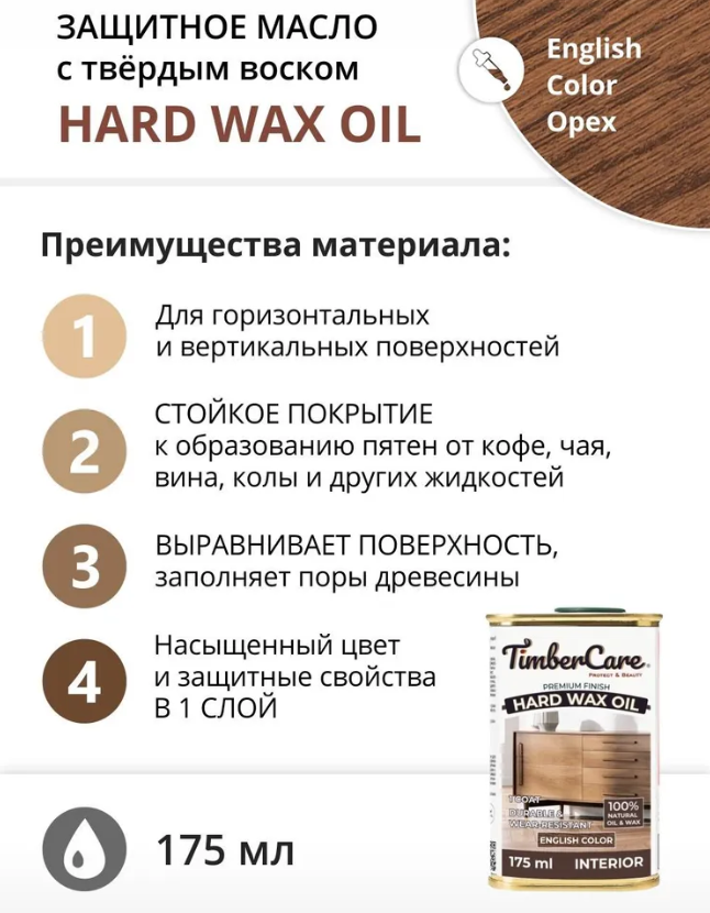 Защитное масло с твердым воском TimberCare Hard Wax Oil, Орех/ English Color 0,175 л информация: