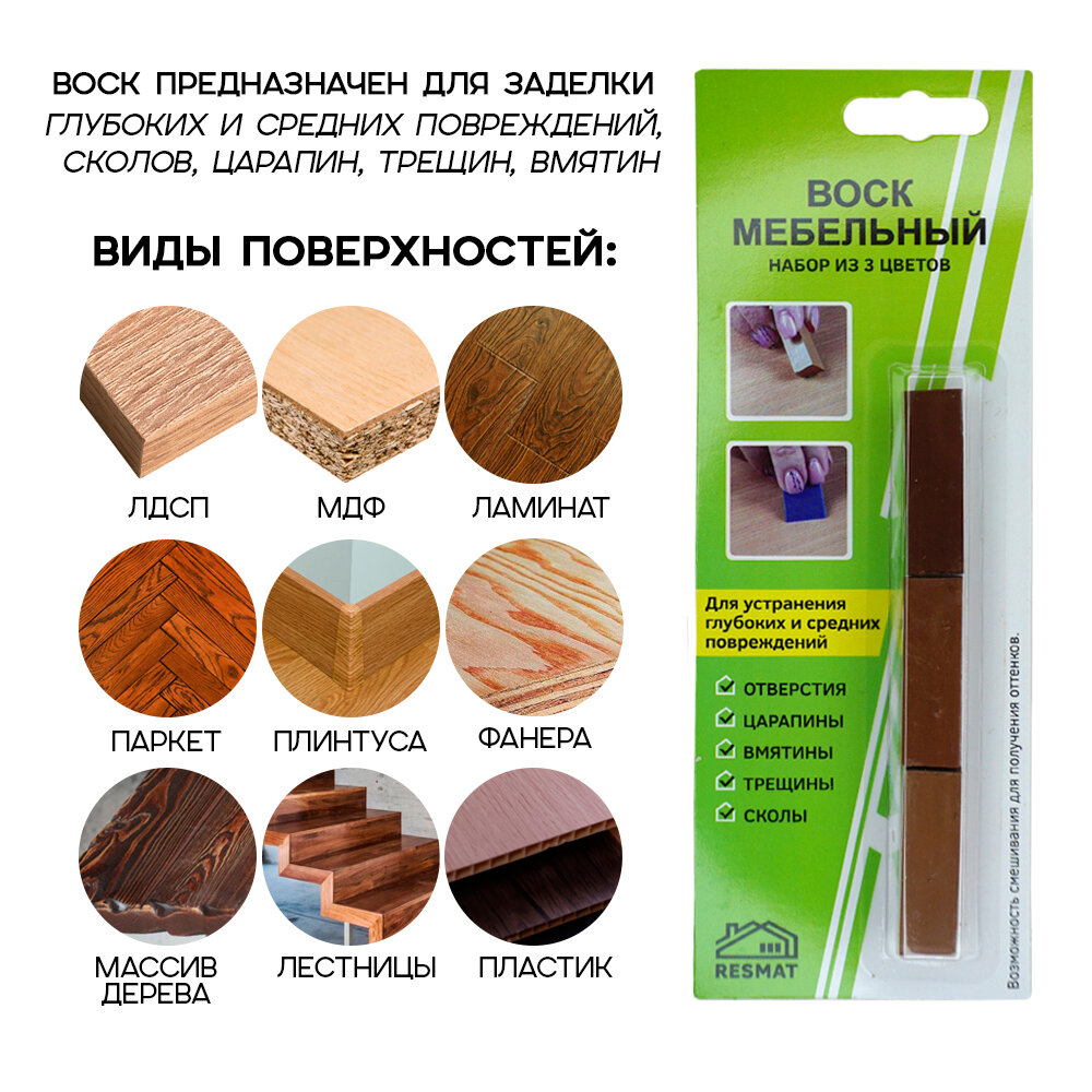 Отзывы на Набор воска мебельный Resmat для реставрации мебели и ламината 3 цвета, набор № 5, светло-коричневые тона