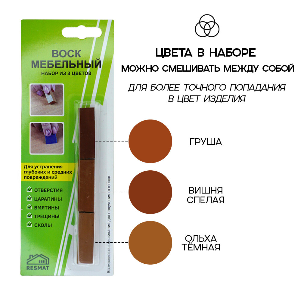 Набор воска мебельный Resmat для реставрации мебели и ламината 3 цвета, набор № 5, светло-коричневые тона информация: