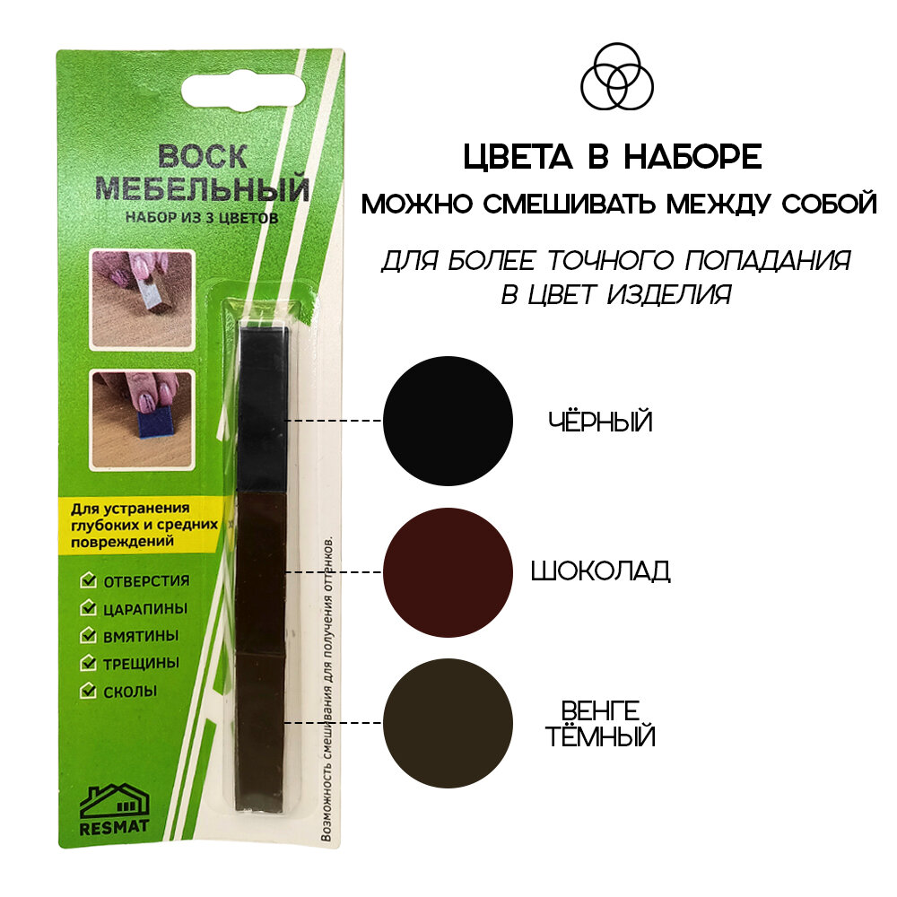 Отзывы на Набор воска мебельный Resmat для реставрации мебели и ламината 3 цвета, набор № 8, шоколадно-черные тона