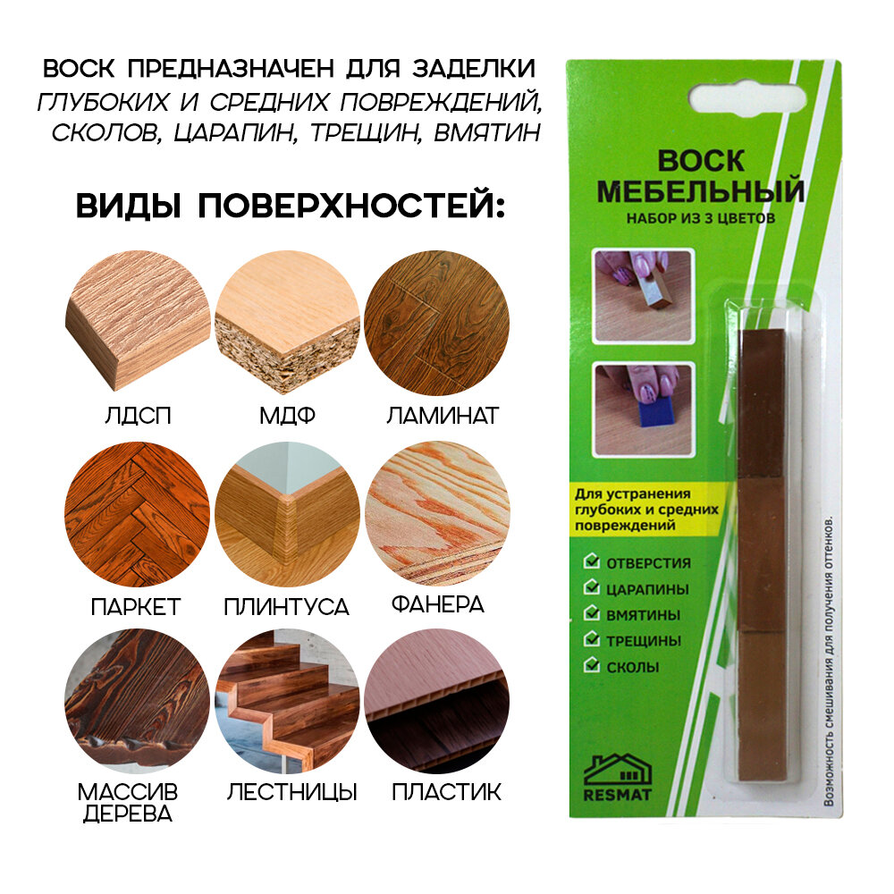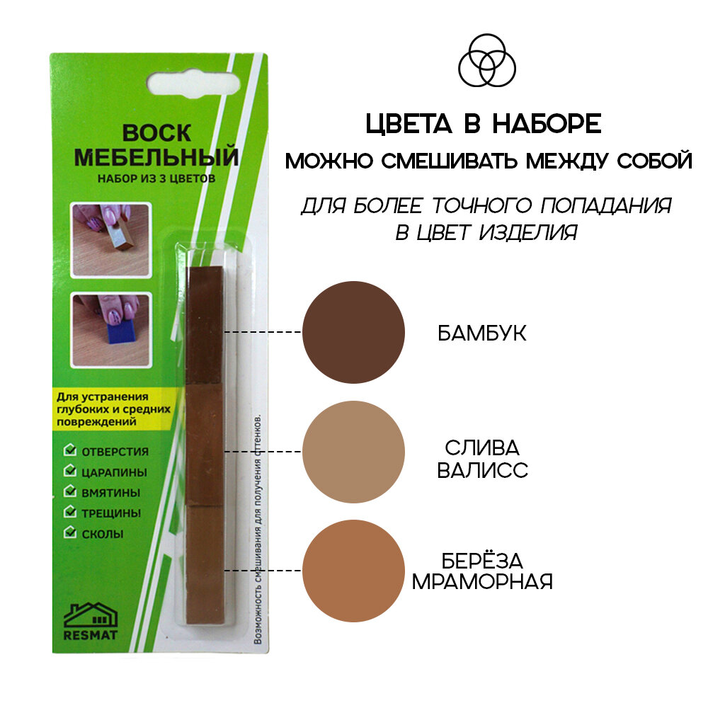 Отзывы на Набор воска мебельный Resmat для реставрации мебели и ламината 3 цвета, набор № 7, темно-коричневые тона