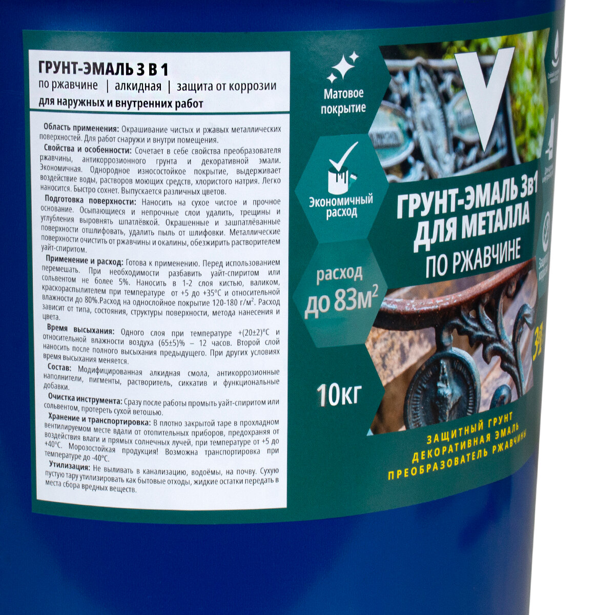 Грунт-эмаль по ржавчине 3 в 1 V, матовая, 10 кг, синяя, 1шт, жестяное ведро 2 475 ₽