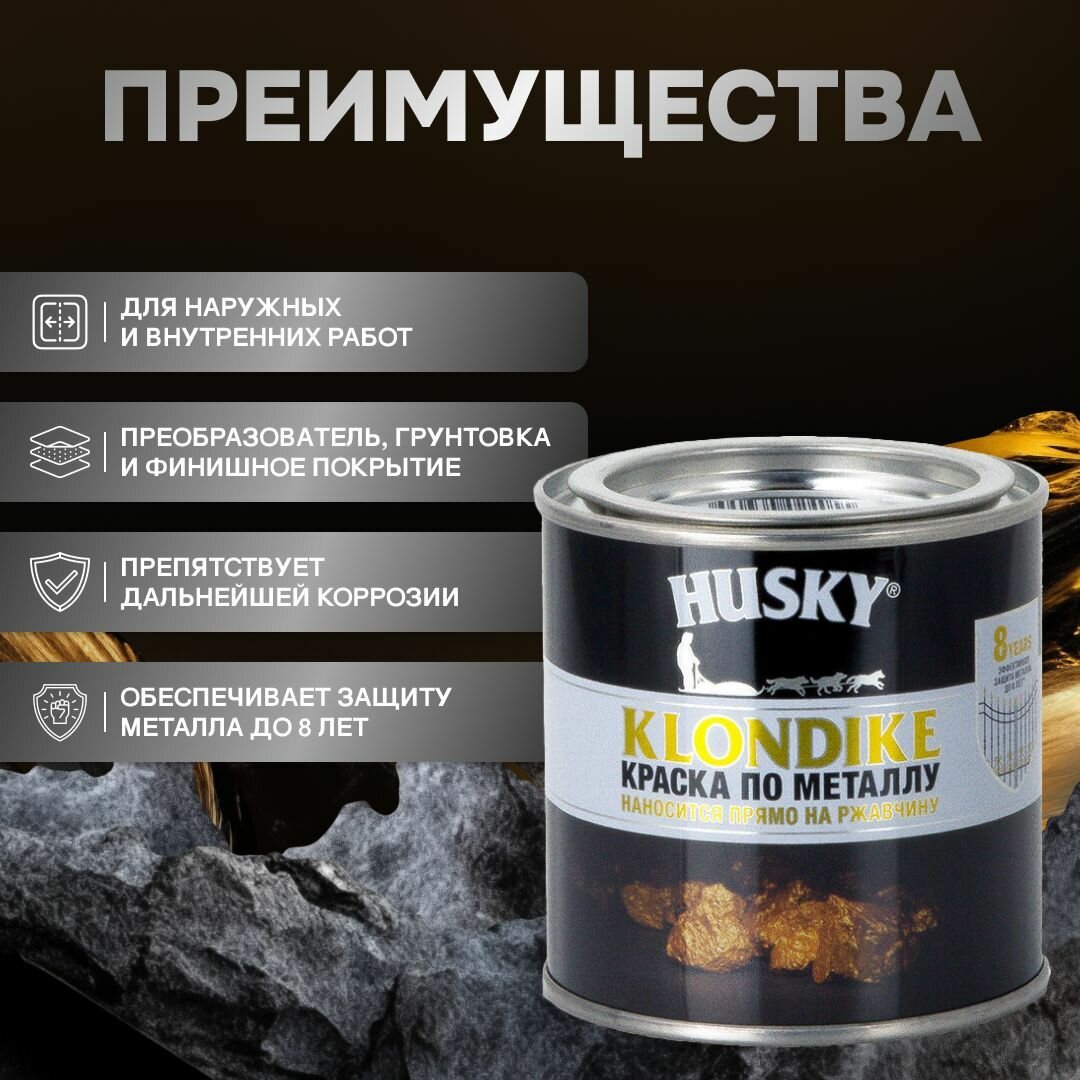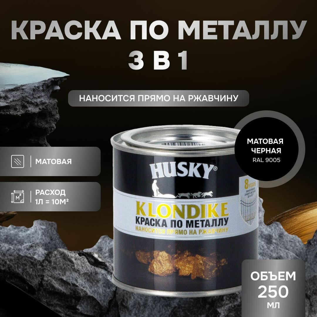 HUSKY KLONDIKE Грунт-эмаль 3 в 1, краска по металлу, по ржавчине, декоративная матовая черная RAL 9005 (250мл) информация: