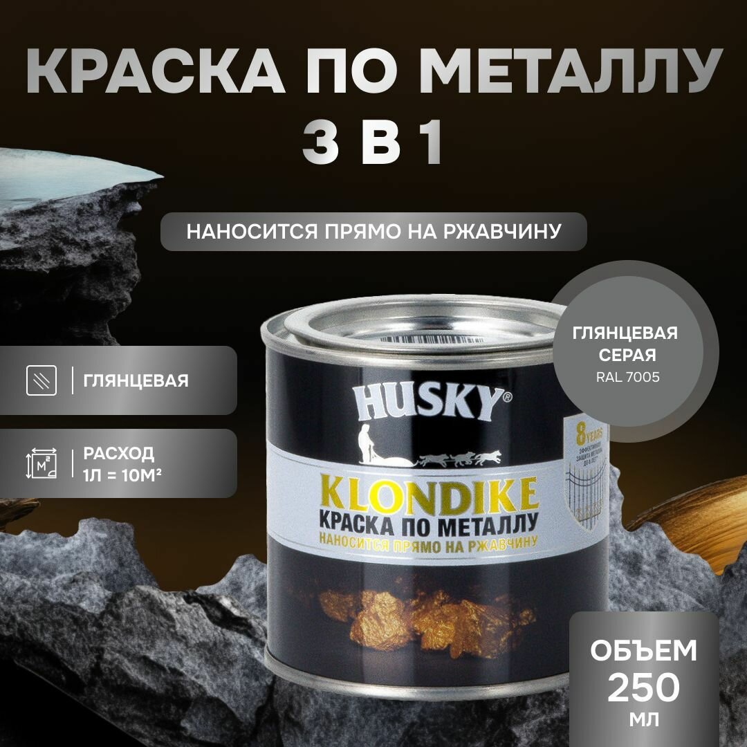 HUSKY KLONDIKE Грунт-эмаль 3 в 1, краска по металлу глянцевая, по ржавчине, декоративная серая RAL 7005 (250мл) информация: