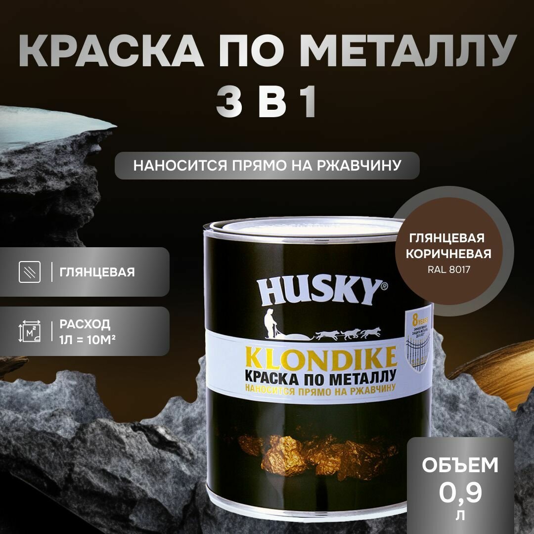 HUSKY KLONDIKE Грунт-эмаль 3 в 1, краска по металлу глянцевая, по ржавчине, декоративная коричневая RAL 8017 (0,9л) информация: