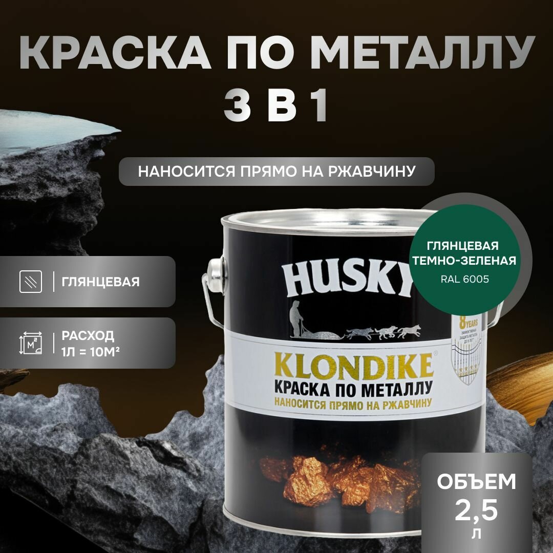 HUSKY KLONDIKE Грунт-эмаль 3 в 1, краска по металлу глянцевая, по ржавчине, декоративная темно-зеленая RAL 6005 (2,5л) информация: