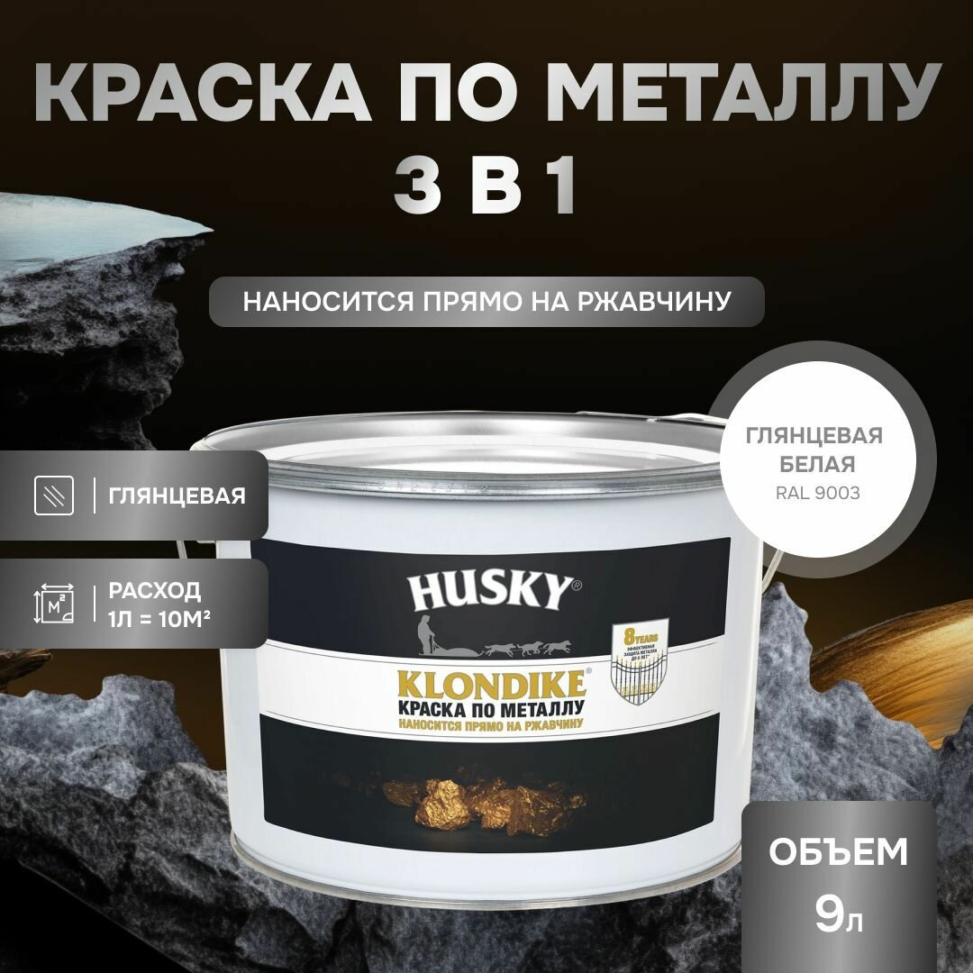 HUSKY KLONDIKE Грунт-эмаль 3 в 1, краска по металлу глянцевая, по ржавчине, декоративная белая база А (9л) информация: