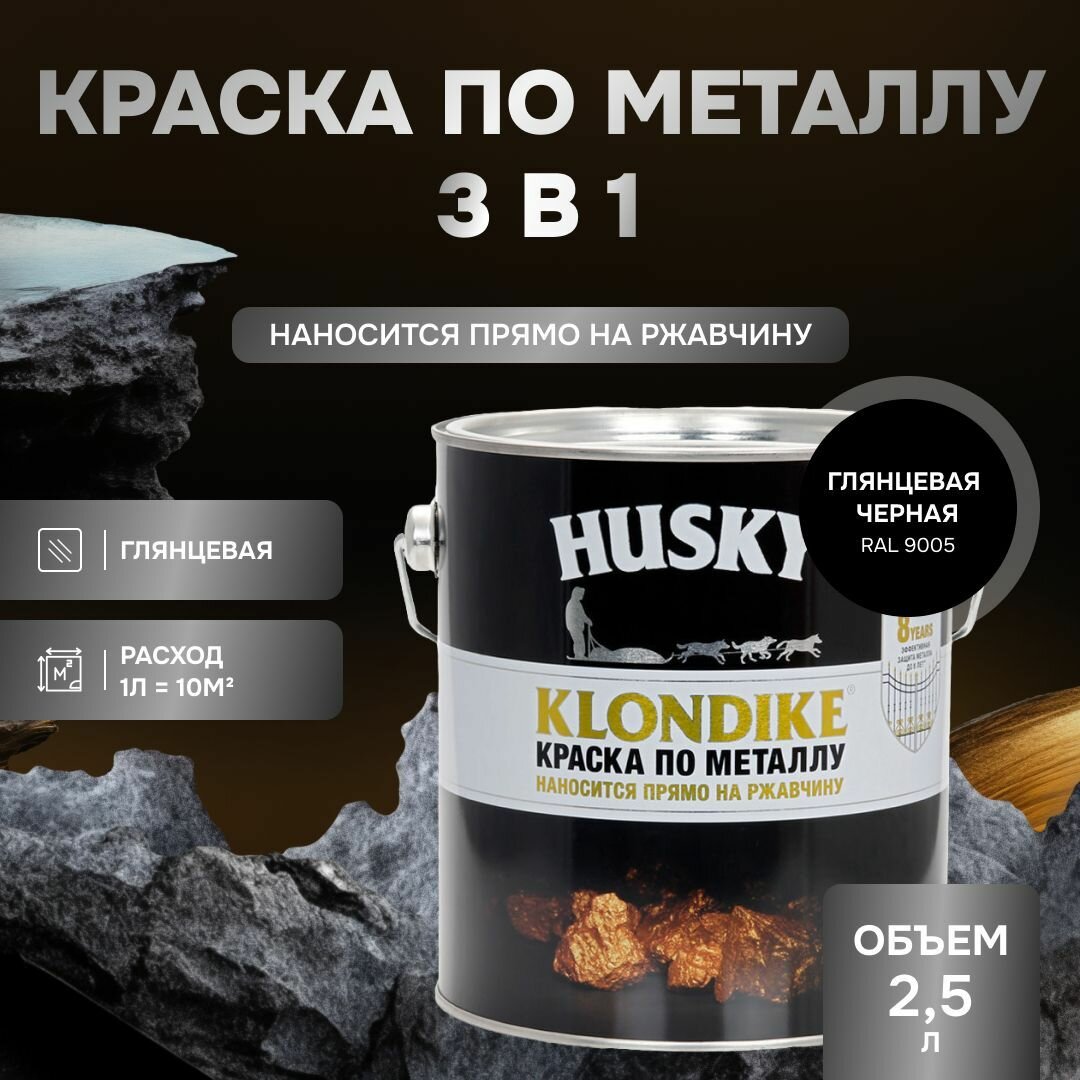 HUSKY KLONDIKE Грунт-эмаль 3 в 1, краска по металлу глянцевая, по ржавчине, декоративная черная RAL 9005 (2,5л) информация: