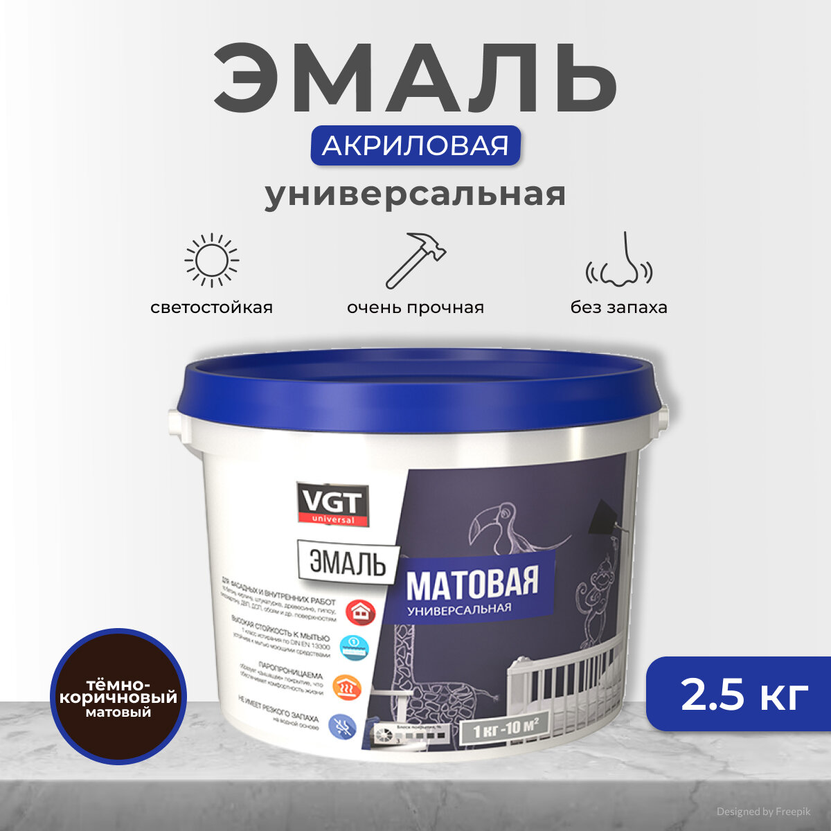 Эмаль универсальная VGT ВД-АК-1179, матовая, 2,5 кг, темно-коричневая, 1шт, пластиковое ведро информация: