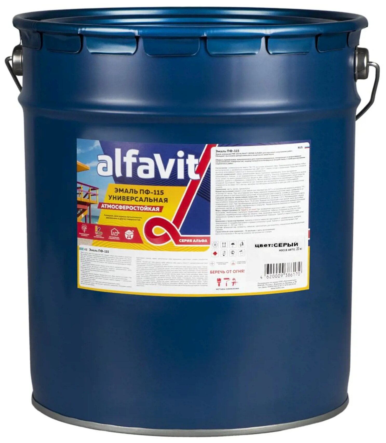 Эмаль ПФ-115 универсальная Alfavit серия Альфа, алкидная, глянцевая, 20 кг, серая, 1шт информация: