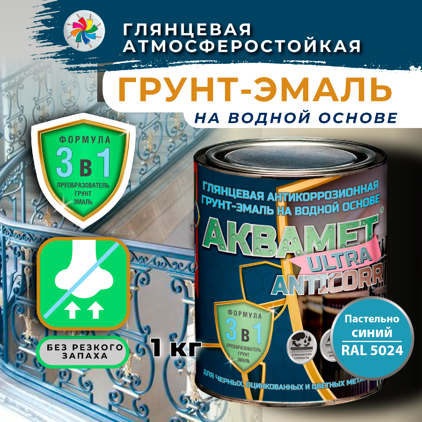 Краска по металлу Аквамет ULTRA Anticorr пастельно-синяя, грунт-эмаль 3в1, глянцевая, без запаха, 1 кг информация:
