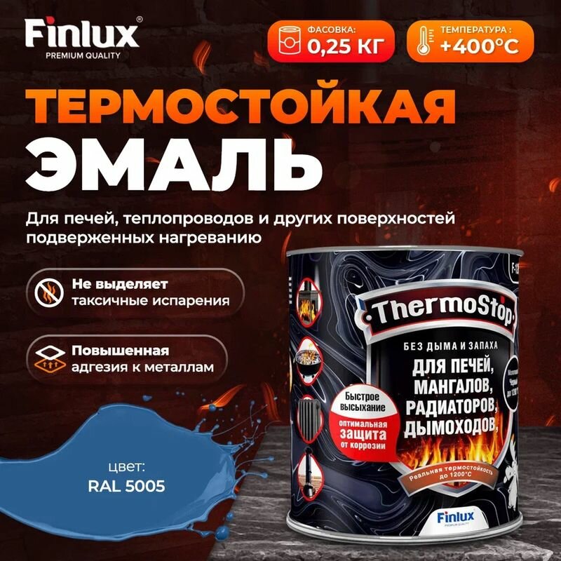 10 цен на Краска, Грунт-Эмаль Finlux F-1200 до +1200C Антикоррозионная, для печей, мангалов, дымоходов, радиаторов, суппортов, глушителей Гладкая, Быстросохнущая, Кремнийорганическая, Матовое покрытие, ral 5005, 0,25 кг, 400 С