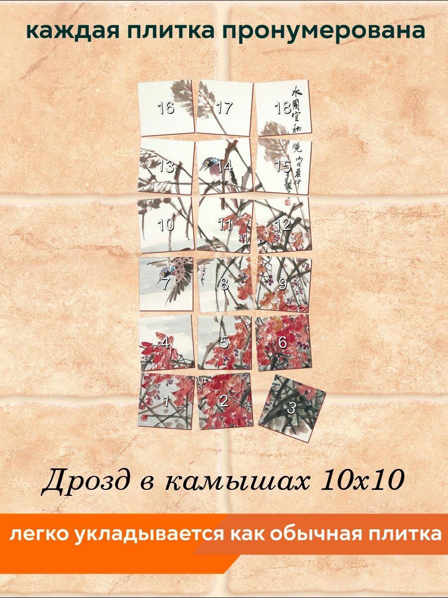 Панно из плитки Fres-co "Дрозд в камышах", керамическое, полуглянцевое, декоративное, 30х60 см информация: