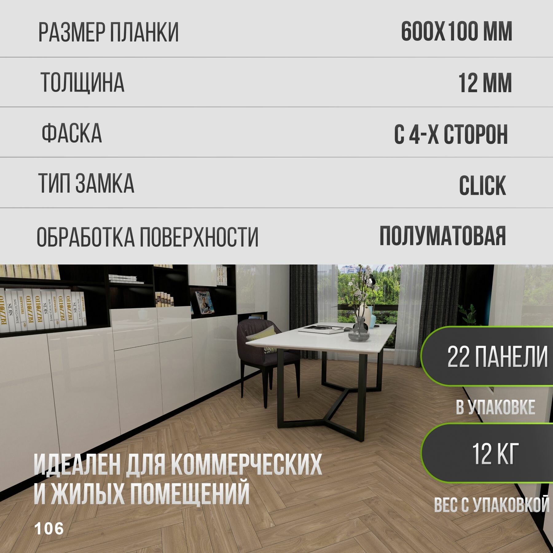 Ламинат напольный влагостойкий WOODSTYLE ARROW 34 класс, толщина 12 мм с фаской, ДУБ компаунд 106 информация: