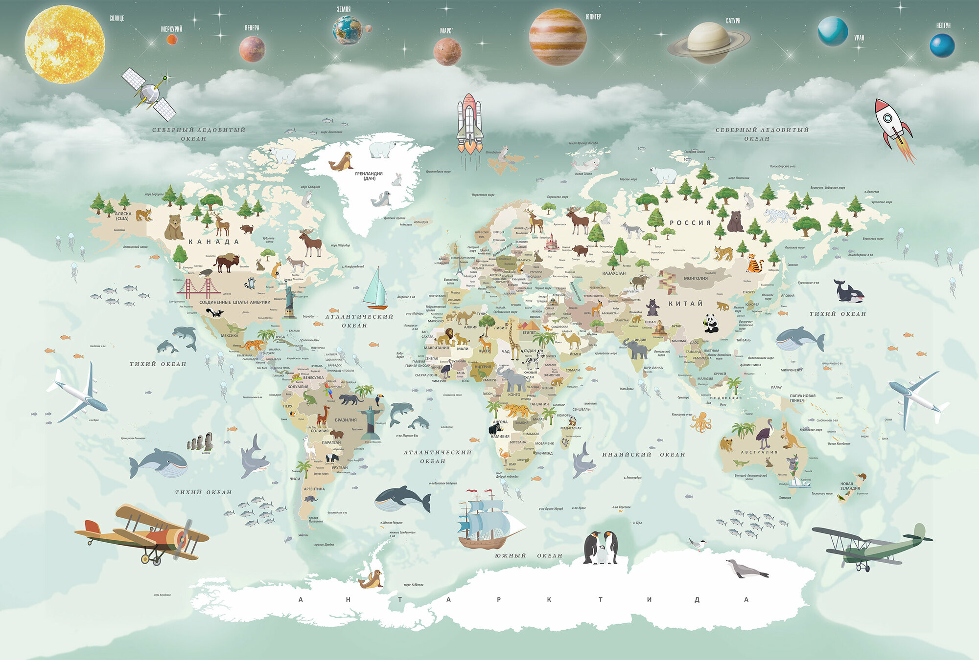 10 цен на Фотообои на стену флизелиновые без винила детские Карта Мира и планеты 400х270 см