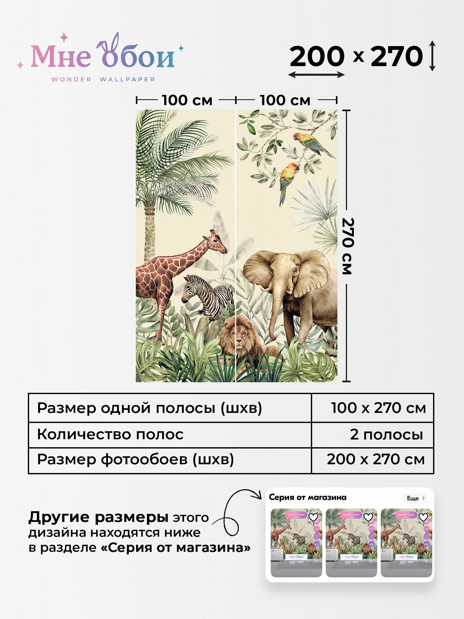 Фреска флизелиновая - детские 3D фотообои на стену "Джунгли" 270х270 (ШхВ), Животные, 3д обои в детскую 4 442 ₽
