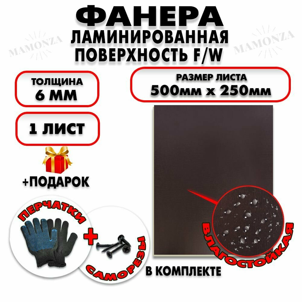 Фанера ФСФ ламинированная/сетчатая F/W толщина 6мм 500х250мм 1 лист информация: