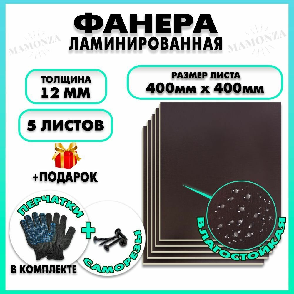 Фанера ФСФ ламинированная F/F толщина 12мм 400х400мм 5 листов информация: