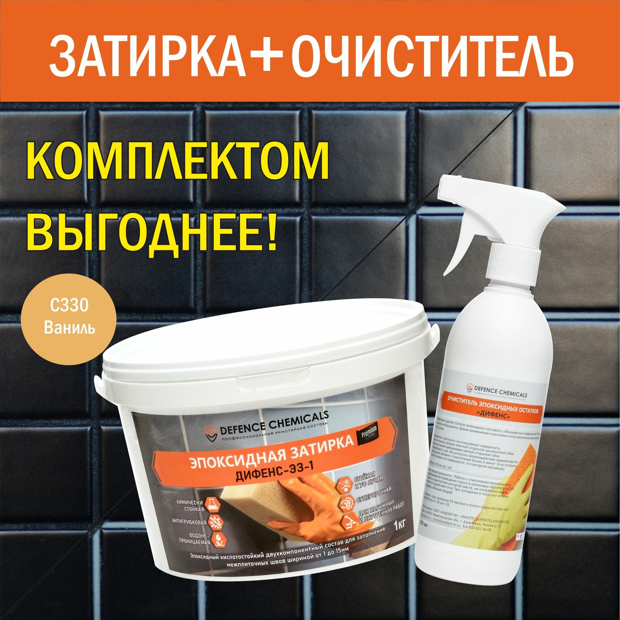 Строительный набор DEFENCE CHEMICALS из 2 предметов: Затирка эпоксидная C330 (ваниль) 1 кг + Очиститель эпоксидных остатков 500 мл информация: