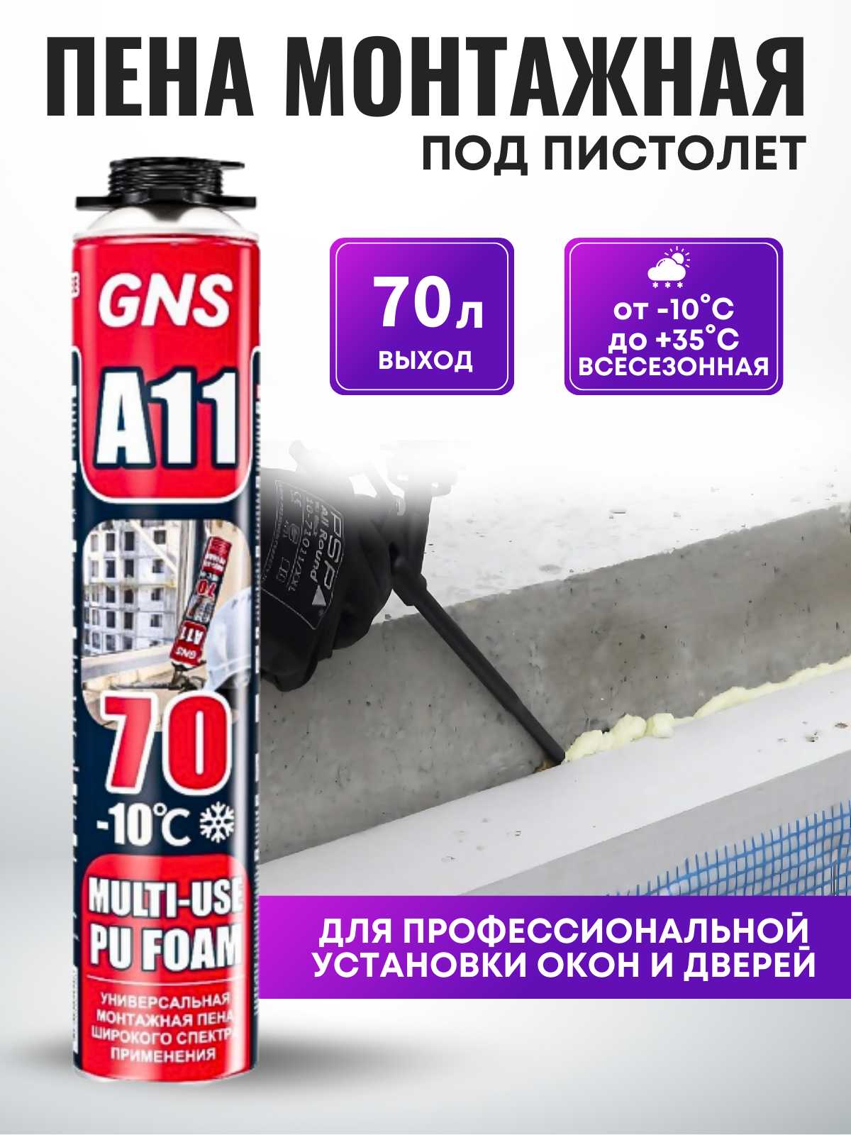 GNS Профессиональная всесезонная монтажная пена GNS A11-70 Multi Use PU foam 70L Gun Type информация:
