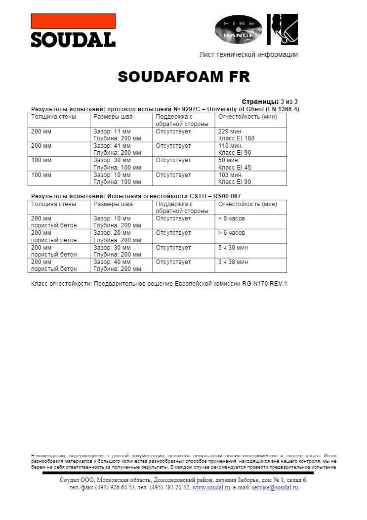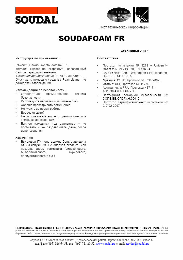 Огнестойкая монтажная пена SOUDAFOAM FR информация:
