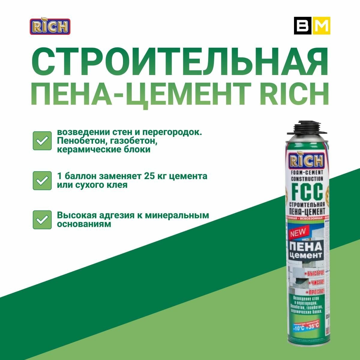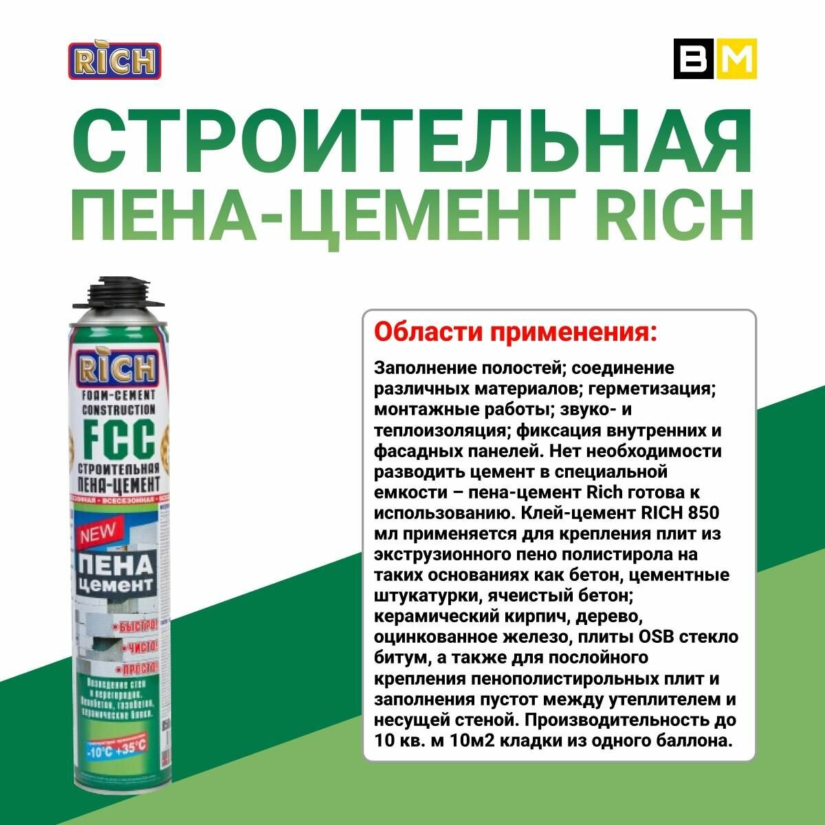Профессиональная строительная пена цемент RICH, всесезонная, 850мл, 1 шт. информация: