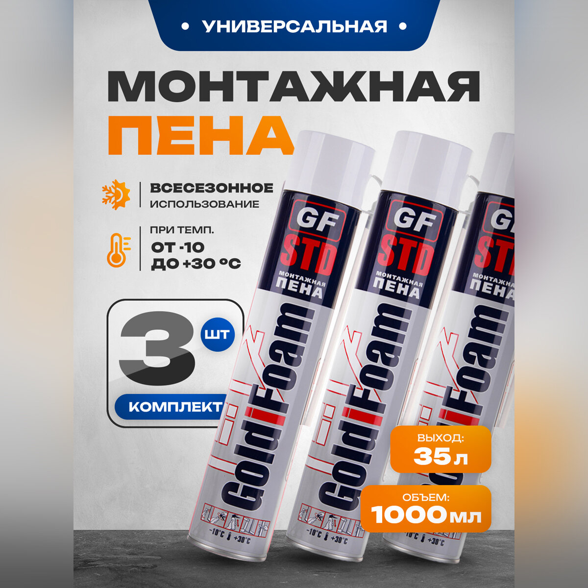 Монтажная пена Goldifoam STD с трубкой для выпуска пены, объем 1000 мл, всесезонная, 3 баллона информация: