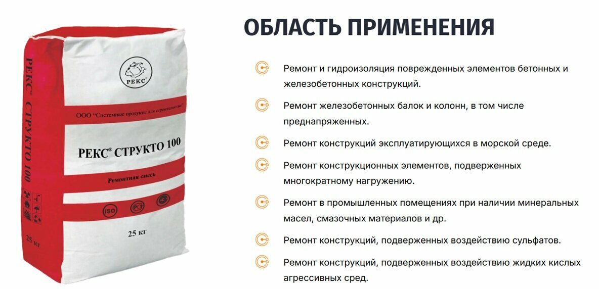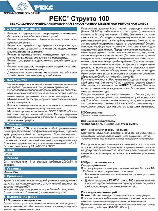 Ремонтный состав Рекс Структо 100 тиксотропный для поврежденных элементов бетонных и железобетонных конструкций 25 кг. информация: