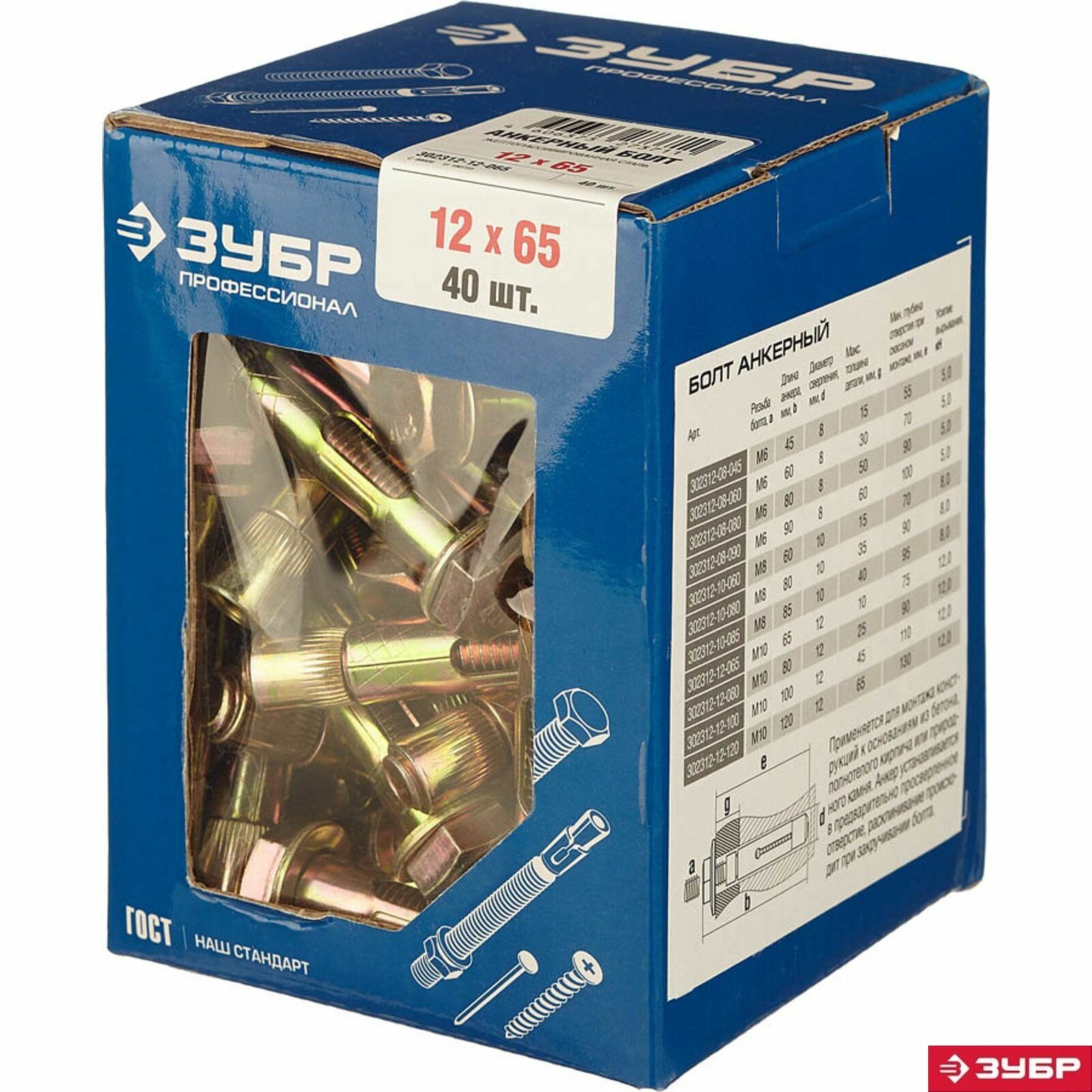 ЗУБР 12x65 мм, 40 шт, желтопассивированный, болт анкерный информация: