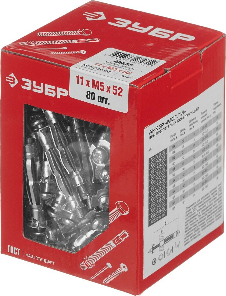 ЗУБР Анкер молли для пустотелых материалов, 11 мм x M5 x 52 мм, 80 шт, оцинкованный, ЗУБР, ( 302472-05-052 ) информация: