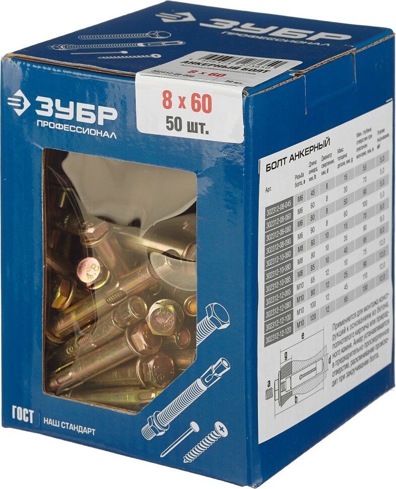 ЗУБР Болт анкерный, 8 x 60 мм, 50 шт, желтопассивированный, ЗУБР Профессионал, ( 302312-08-060 ) информация: