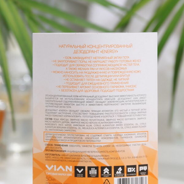Натуральный концентрированный дезодорант VIAN "ENERGY", 50 мл.
