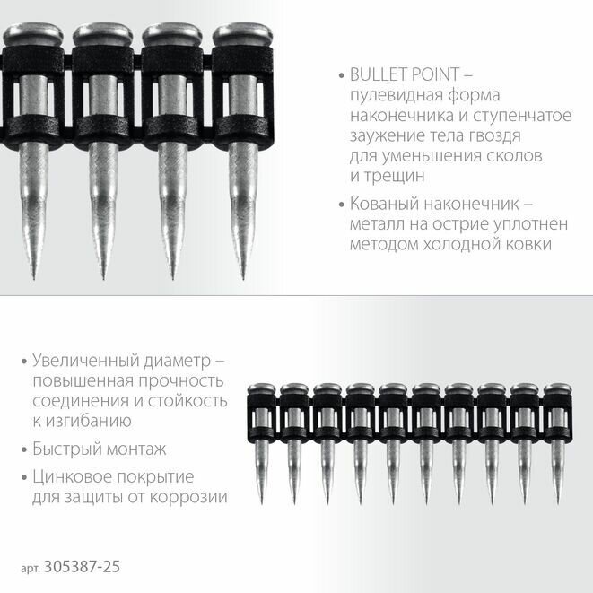 Гвозди по бетону оцинкованные 1000 шт усиленные bullet point 25 х 3.05 мм ЗУБР 305387-25 информация: