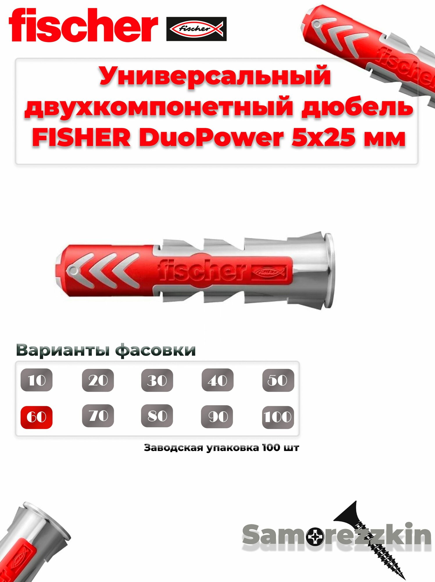 Дюбель Fischer DuoPower, нейлон, универсальный, 5x25мм, 60 шт информация: