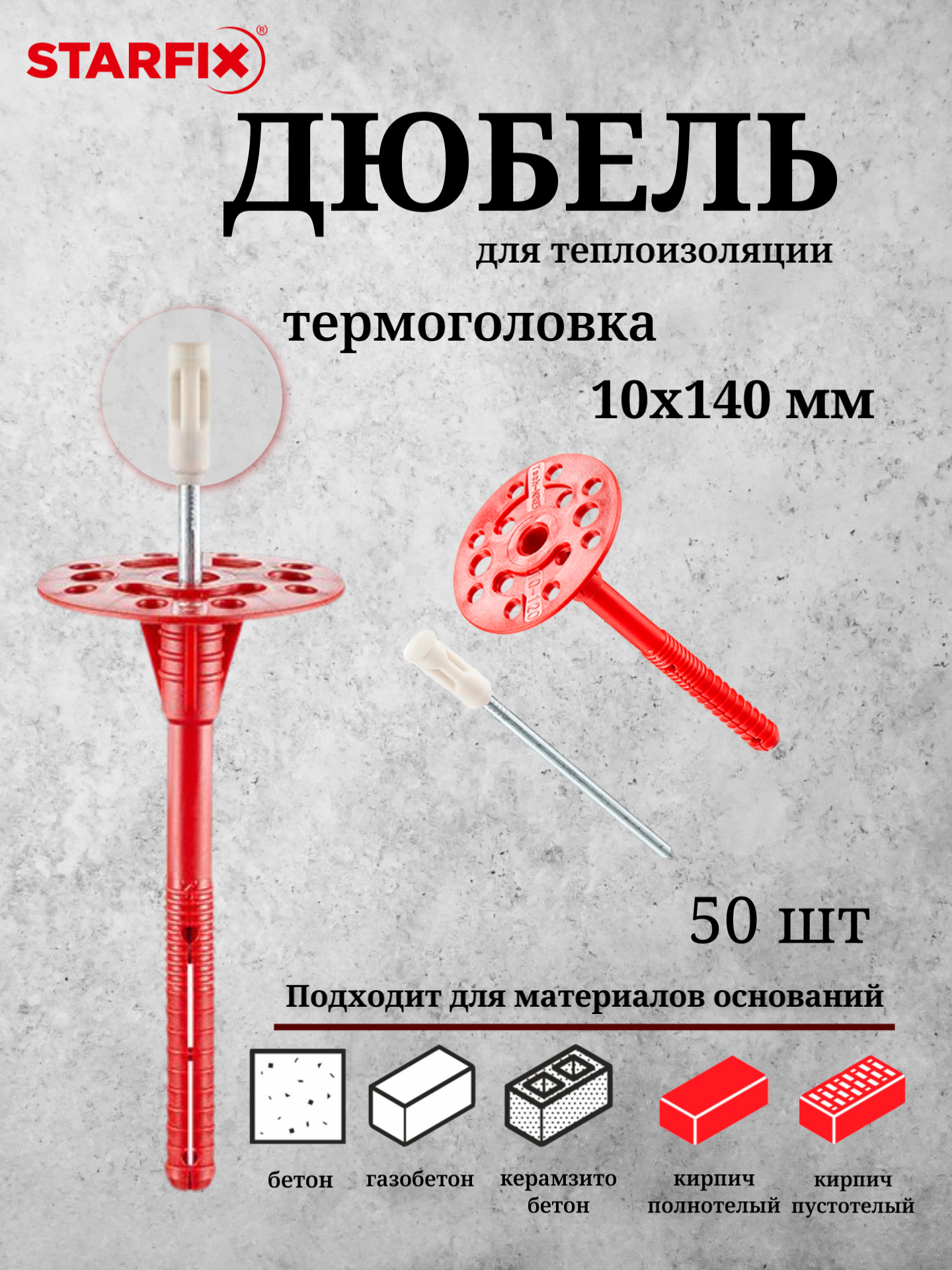 Отзывы на Дюбель для теплоизоляции STARFIX SMW3-54190-500 10х140 мм с металлическим гвоздем термоголовка 50 шт в дой-паке