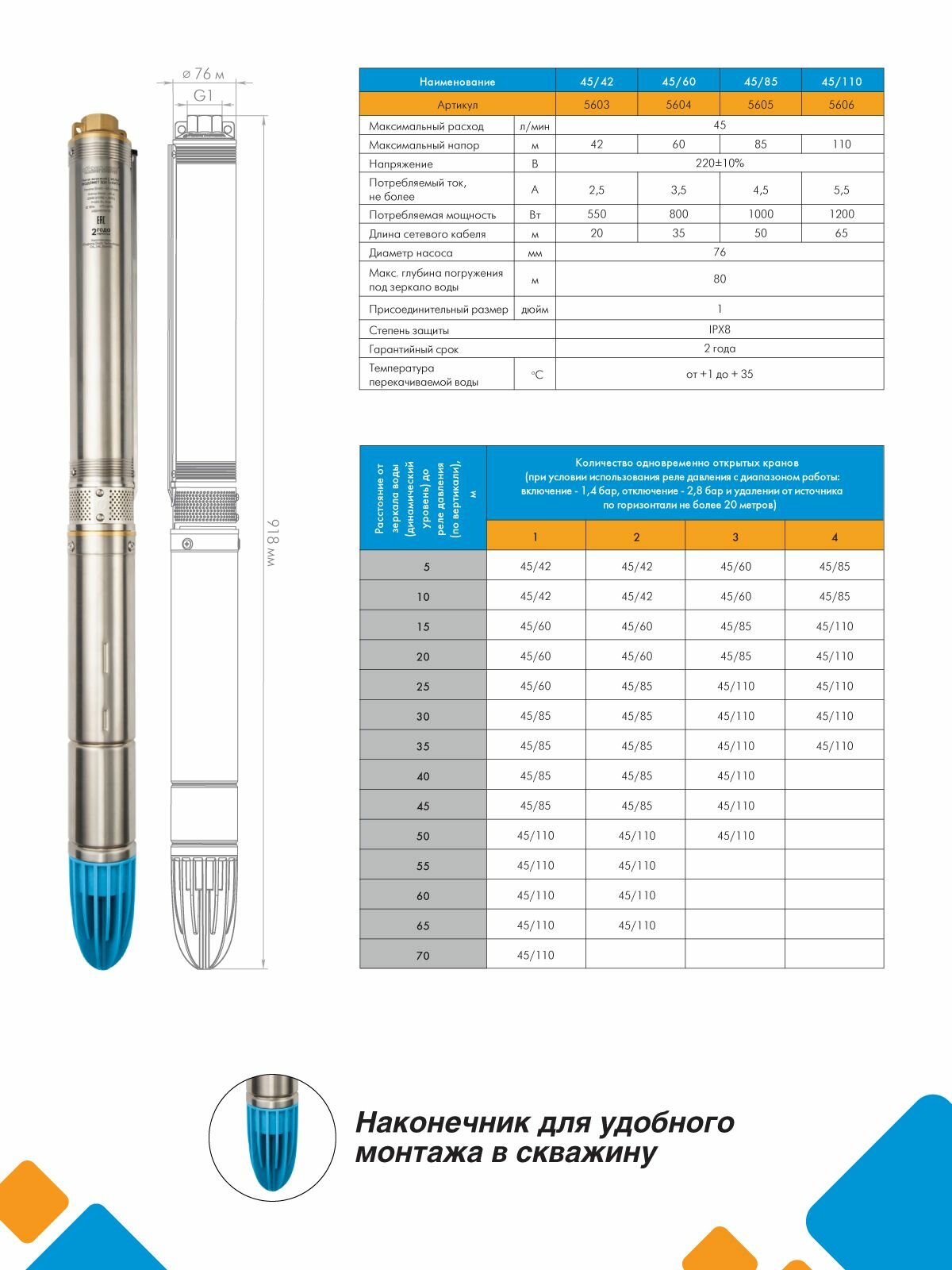 Насос глубинный скважинный ДЖИЛЕКС водомет ЗДК 45/42 каб. 20м. 2,7 м3/ч, насос для скважины 0-12м информация: